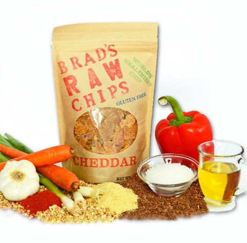 Brad's Raw Chips are so different than any otherchip, that we hate referring to them as a chip...they are actually acomplete meal! While many chips claim to be made from vegetables,most are primarily made from root products such as potatoes. Brad'sRaw Chips are made entirely from sprouted flax seeds, groats and avariety of vegetables and spices...that's it!The World's Healthiest ChipBrad's Raw Foods is the home of "The World's Healthiest Chip."In 2007, founder and creator, Brad Gruno made significant changes in his life and discovered the health benefits of eating raw. Despite the benefits of the raw diet, one thing he really missed was the crunch of a good snack. In 2008, Brad began making raw chips in his kitchen to satisfy that craving. Just 2 and a half years later, he's happy to be able to share his snack with others.Our products are truly the "Healthiest Chips in the World". Dehydrated below 115 degrees to preserve the nutrients and enzymes that aid digestion and keep you energized, you no longer have to feel guilty about indulging in your favorite snack!3oz Cheddar Flavor - Famous Brads Raw Chips - Vegan, Gluten Free, Natural, Healthy Snack Feature