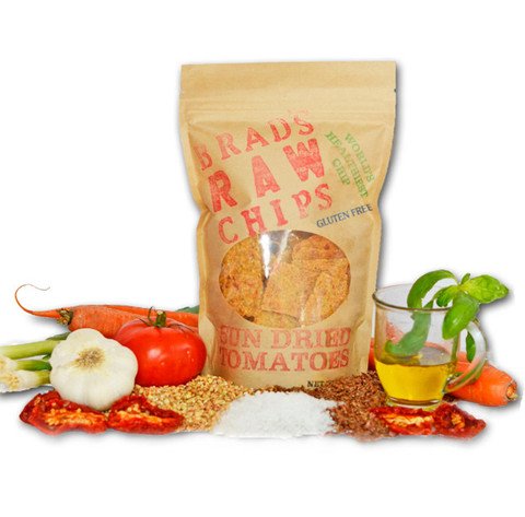Brad's Raw Chips are so different than any otherchip, that we hate referring to them as a chip...they are actually acomplete meal! While many chips claim to be made from vegetables,most are primarily made from root products such as potatoes. Brad'sRaw Chips are made entirely from sprouted flax seeds, groats and avariety of vegetables and spices...that's it!The World's Healthiest ChipBrad's Raw Foods is the home of "The World's Healthiest Chip."In 2007, founder and creator, Brad Gruno made significant changes in his life and discovered the health benefits of eating raw. Despite the benefits of the raw diet, one thing he really missed was the crunch of a good snack. In 2008, Brad began making raw chips in his kitchen to satisfy that craving. Just 2 and a half years later, he's happy to be able to share his snack with others.Our products are truly the "Healthiest Chips in the World". Dehydrated below 115 degrees to preserve the nutrients and enzymes that aid digestion and keep you energized, you no longer have to feel guilty about indulging in your favorite snack!3oz Sun Dried Tomato Flavor - Famous Brads Raw Chips - Vegan, Gluten Free, Natural, Healthy Snack Feature