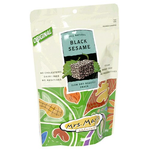All natural. Vegan. Dairy free. Wheat free. No cholesterol. At Mrs. May's we're mostly nuts! The good kind. Peanuts. Almonds, Pecans. Cashews. Walnuts. They're slowly dry roasted, given a dash of sea salt and brushed with sweetness for a world class crunch. We care about what we put in our mouths - yours too. We use only premium-grade, wholesome ingredients. No artificial colors or flavors. And we believe in free - as in cholesterol-free, dairy-free, wheat-free. We put plenty of natural goodness in our light and crunchy snacks. But mostly, we're nuts. Product of China.Mrs. May's Dry-Roasted Snack, Black Sesame, 5.5-Ounce Pouches (Pack of 12) Feature
