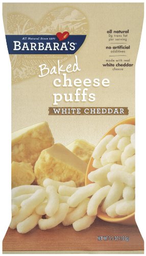 Baked to be addictively crispy, dusted with the tangy taste of real white cheddar.Barbara's Bakery Baked White Cheddar Cheese Puffs, 5.5-Ounce Bags (Pack of 12) Feature