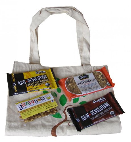 Ideal snack for those desiring a Raw Vegan diet Contents: Raw revolution organic live food bar (2) Go Raw live granola bar (1) gRAWnola raw food bar (1) Eco friendly and reusable canvas tote bag (1) 100% certified Raw Vegan *brand and item subsitutions Always Free Ground ShippingRaw Vegan Snack Pack Feature