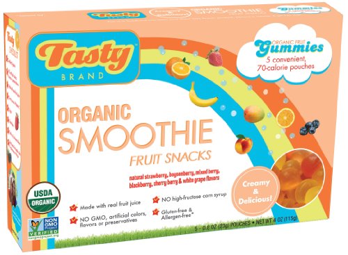 Tasty Brand Organic Fruit Gummy Snacks are the delicious answer to sweet cravings for kids ages 2 to 102. They were created by 2 moms on a tasty mission to make healthier, fun foods and there’s no guilt because our gummies contain nothing artificial or unhealthy. They’re the ideal snack that’s sure to put a smile on anyone’s face. Our new Smoothie flavor contains a delicious mix of natural blueberry, peach, orange, mango, banana & strawberry crème flavors. Certified USDA organic. Made with real fruit juice. 100% daily value of antioxidant vitamin C. NO high-fructose corn syrup. NO artificial colors, flavors or preservatives. Gluten-free, fat-free and cholesterol-free. Vegan (gelatin-free). Each box contains five 0.8-oz pouches, only 70 calories each! Packaging is made from 100% recycled paper and printed with vegetable-based inks.Tasty Brand Organic Fruit Snacks, Smoothie, 4-Ounce Boxes (Pack of 6) Feature