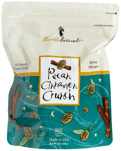 We use only the finest ingredients to bring you this tasty, natural snack. These crunchy little morsels are slowly dry-roasted with a pinch of sea salt, lightly glazed with sweetness, then packaged in-house to guarantee freshness. Best of all, they’re all natural, cholesterol free, gluten-free, 0g trans fat, and 100% vegan.Mareblu Naturals Pecan Cinnamon Crunch, 20-Ounce Pouch Feature