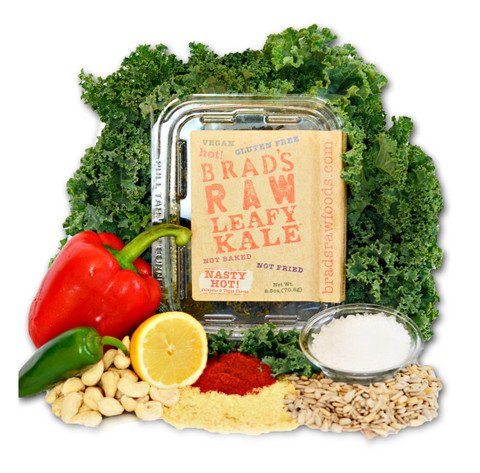 Brad's Raw Leafy Kale starts out with the mostnutritionally dense leafy vegetable available...fresh, leafy kale!We then batter it up with some flavorful, natural ingredientsincluding raw cashews and sunflower seeds, nutritional yeast togive it that vegan cheese flavor, and some tasty vegetables to addsome zest.The product is then dehydrated below 115 degrees (retainingactive enzymes) to transform it into a light, crunchy and delectablesnack food that rivals any popular, unhealthy snack.Brad's Raw Foods is the home of "The World's Healthiest Chip."In 2007, founder and creator, Brad Gruno made significant changes in his life and discovered the health benefits of eating raw. Despite the benefits of the raw diet, one thing he really missed was the crunch of a good snack. In 2008, Brad began making raw chips in his kitchen to satisfy that craving. Just 2 and a half years later, he's happy to be able to share his snack with others.Our products are truly the "Healthiest Chips in the World". Dehydrated below 115 degrees to preserve the nutrients and enzymes that aid digestion and keep you energized, you no longer have to feel guilty about indulging in your favorite snack!(Summer Special Up to 20% Off!) 2.5oz "Nasty Hot" Kale - Jalapeno & Vegan Cheese Flavor - Famous Brads Raw Foods - Vegan, Gluten Free, Natural, Healthy Snack Feature